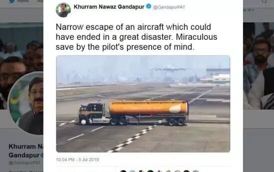 这位巴基斯坦的官员因为看了一段客机着陆时紧急拉升避让油罐车的短片后,发推称赞: